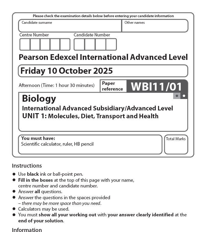 EDEXCEL IAL BIOLOGY 2025 OCTOBER QUESTION PAPERS WITH MARKING SCHEME